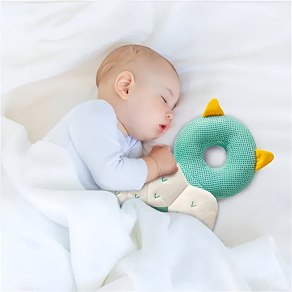 Овој мек и нежен јастук за глава на бебето може да биде релаксирачки другар за бебето за време на попладневните дремки и спиењето. Дишливиот и мек материјал е нежен кон кожата на бебето, осигурувајќи дека останува удобно и опуштено. Оваа позната и удобна присутност помага да се смири бебето, правејќи го полесно да се опушти и заспие.